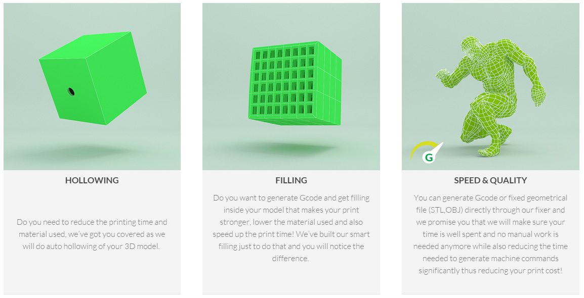 Întregul proces se realizează în trei pași: se cere fișierul cu obiectul 3D de printat, tipul de printer folosit, formatul de exportare și gata! Fișierul va fi preluat de o serie de algoritmi complicați care vor modifica modelul pentru a-l pregăti pentru printare.